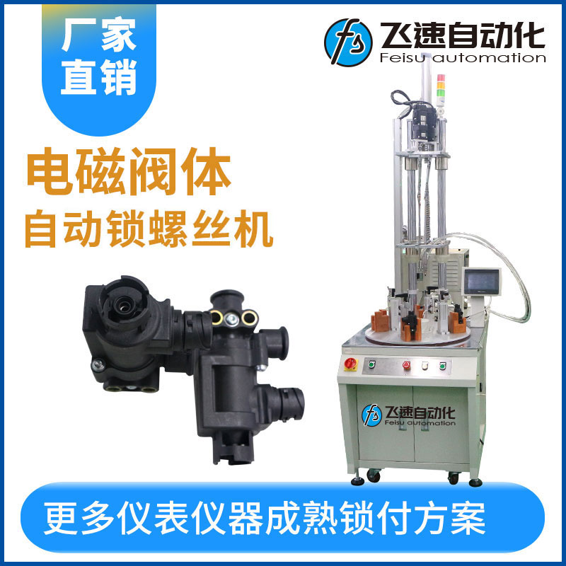 電磁閥閥體在生產(chǎn)中需要有精密的質(zhì)量控制,在裝配中需要螺絲緊固,采用手工業(yè)作來(lái)尋找螺絲孔對(duì)準(zhǔn)在鎖付,由于無(wú)法看清螺絲孔的內(nèi)部,人工在作業(yè)時(shí)容易導(dǎo)致把產(chǎn)品擰壞或者滑牙等問(wèn)題導(dǎo)致工作效率低生產(chǎn)標(biāo)準(zhǔn)品質(zhì)低,為解決這些生產(chǎn)問(wèn)題,廠家通常都會(huì)采用機(jī)器人或者電動(dòng)螺絲刀來(lái)實(shí)現(xiàn)高度柔性自動(dòng)化生產(chǎn),飛速自動(dòng)化在這里為廠家設(shè)計(jì)了一臺(tái)轉(zhuǎn)臺(tái)式多軸自動(dòng)鎖螺絲機(jī),該設(shè)備特點(diǎn)如下: