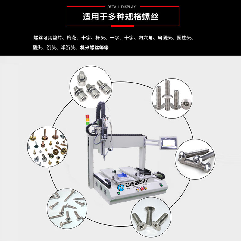 飛速自動化根據驅動器產品結構進行設計了一臺雙平臺坐標是自動擰螺絲機,驅動器需兩部分鎖付,其采用柔性化設計,并適合對同一產品不同型號的加工工件進行自動打螺絲,設備由PLC控制鎖付工路徑,各個工位實現單獨加工,配置觸屏器,控制器界面實時顯示擰緊過程的主要數據:扭力實際值、過程時間、是否合格等;由觸摸屏幕顯示、設置,設備還可以實時檢測轉速、控制軟啟動、控制轉角,篩選滑牙、假鎖等錯誤功能。 雙平臺坐標式螺絲機取螺上螺系統可同時進行取螺、上螺,并自動完成鎖緊動作,自動化程度高,定位效果精度高,使用簡單、方便、快捷,大幅度提高生產效率。