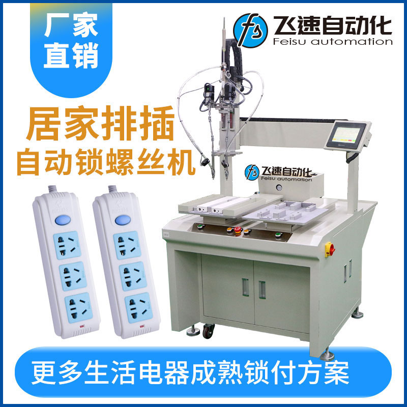 那么排插在生產線進行大批量產品生產、加工、裝配時,涉及到螺絲安裝的時候,需要人工手工完成,人工不僅需要對工件進行夾緊定位,還需要人工操作提供螺絲、對螺絲進行定位和操作手動擰螺絲工具,對操作人員的技術方面難度加大了一點,同時還會降低加工效率,并且也帶來了大量人工成本的提高等,針對這一問題,飛速自動化根據產品設計一臺自動加擰緊工螺絲設備可以在流水作業時,自動輸送、自動供料、自動夾緊工件、自動分螺絲方向、自動定位、自動找正螺孔、自動扭緊的自動加工螺絲設備,以解決人工完成上述操作帶來的產品一致性差、操作效率低以及人工成本高的問題。 排插的外殼體需8顆螺絲鎖付,螺絲類型為內十字圓頭螺絲,為提高效率。